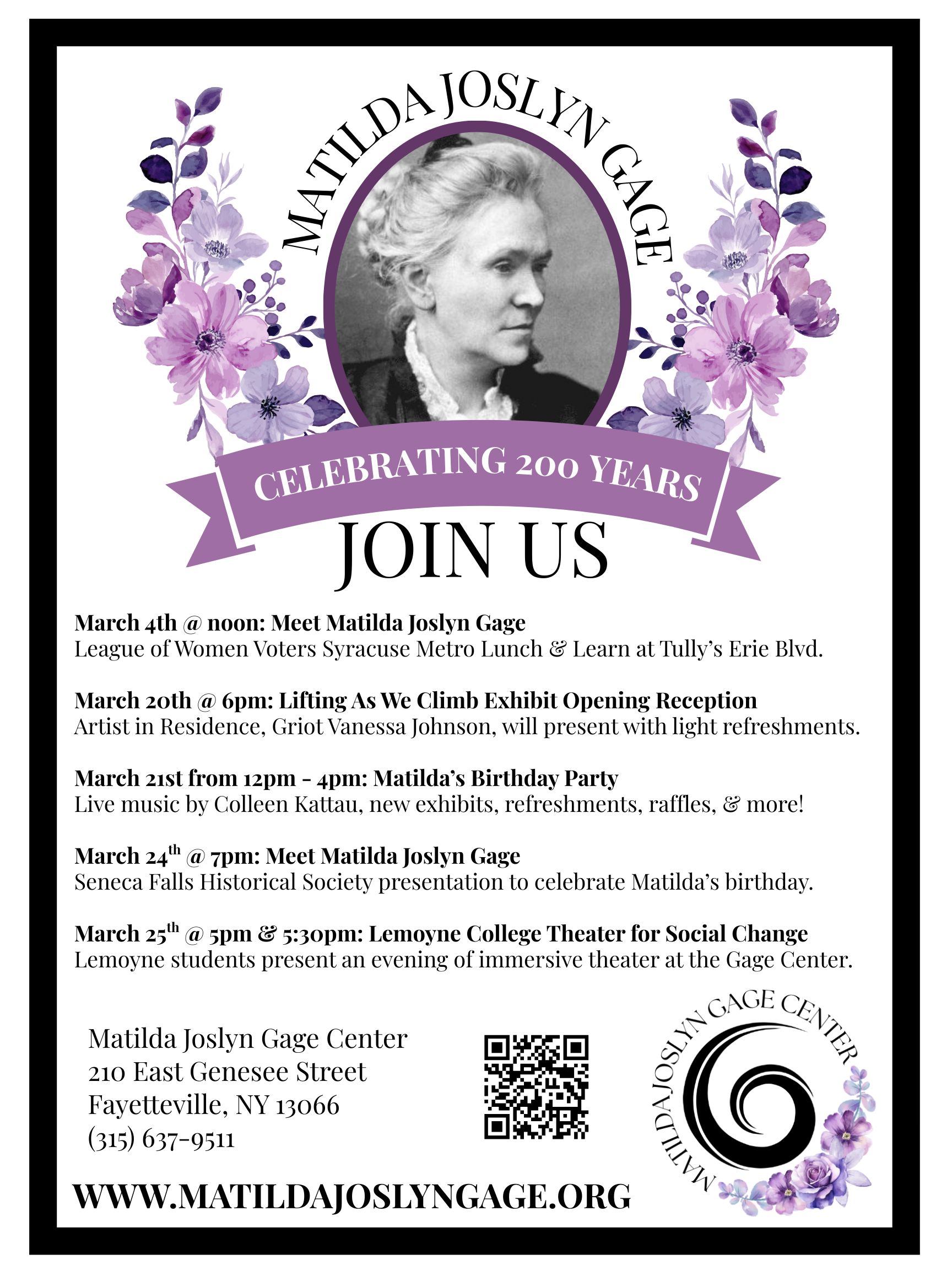 Join us for a celebration of Matilda Joslyn Gage’s 200th Birthday! New exhibit by Gage Artist in Residence, Vanessa Johnson: Lifting As We Climb. Live music performance by Colleen Kattau - https://colleenkattau.com/ Tea, coffee, and chacutterie will be available throughout the day. New exhibit spaces revealed, a live fundraising auction, brick fundraiser, join the Matilda Society, and the release of the Matilda Joslyn Gage Foundation Publishing House’s first book!